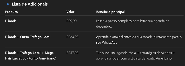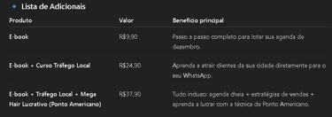 “Além do e-book que já vai te mostrar como lotar sua agenda em dezembro, você pode turbinar seu pacote com conteúdos extras que vão acelerar seus resultados.”